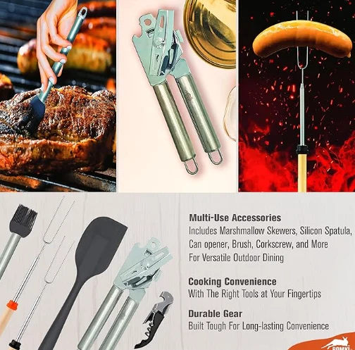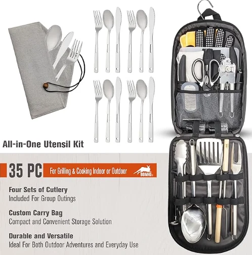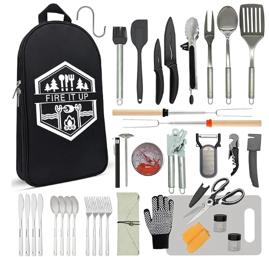 Outdoor Camping Cookware Storage Bag Denna 35 PC Camping Cooking -redskapsredskap är en komplett lösning för dina utomhusmatlagningsbehov. Det innehåller en campingkökssats och campingredskap matlagningssats, allt snyggt packat i en anpassad väska med extra fack och två bakfickor. Uppsättningen är utformad för att tillgodose alla dina camping matlagningsområden, vilket gör det till ett oumbärligt tillägg till din campingutrustning