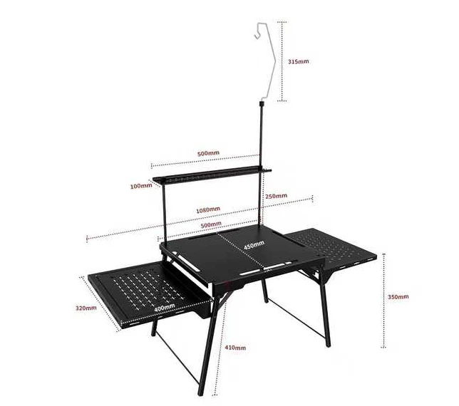 Bärbar vikning av aluminium-järn campingbord, matbordsplattform består av övre, mitten och nedre delar, med tillräckligt med utrymme för att lagra alla typer av bordsartiklar, mat och smaktillsatser.