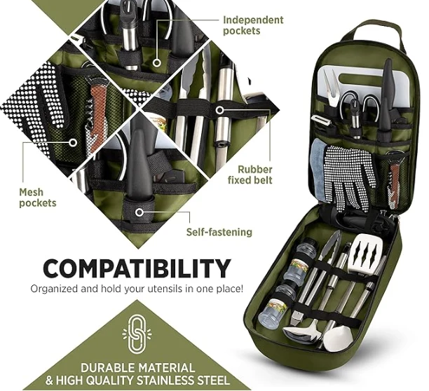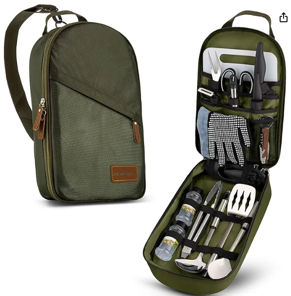 Portabel utomhuscampingverktygsväska, varje redskap har sin egen utsedda påse, så att enheter inte blir smetade, repade eller skadade i förvaring eller under transport. Ger enkel åtkomst till dina matlagningsredskap och det är utrustat med en säker zip -tätning